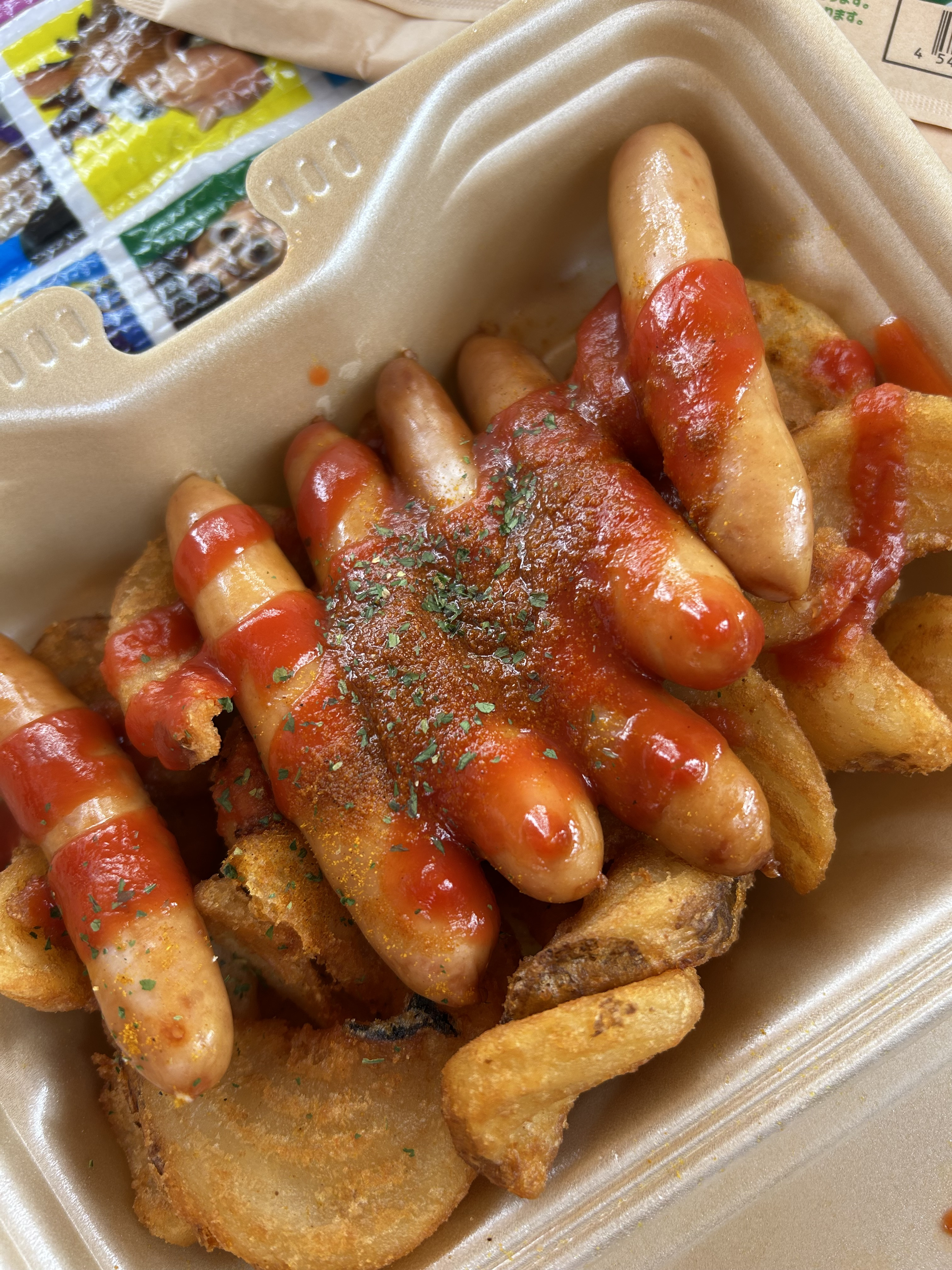 ドイツ(ベルリン)の名物料理でポテトとソーセージの上にカレー風味ケチャップがかかっています。